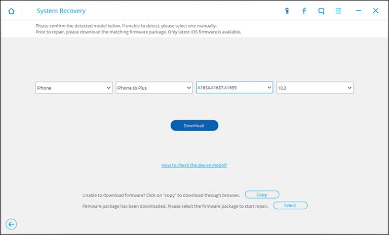 - Choose the appropriate iPhone model from the drop-down menu. The most recent firmware version will then be auto-populated by dr.fone. Then choose “Download.”