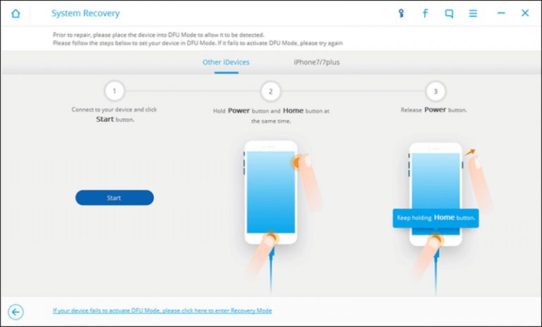 - Now, you need to enter DFU mode to boot up your iPhone. This is done by holding the Home button and the Power button at the same time for ten seconds. Keep holding the Home button, but let go of the power button. Continue holding Home until you’re notified that DFU mode has been reached.