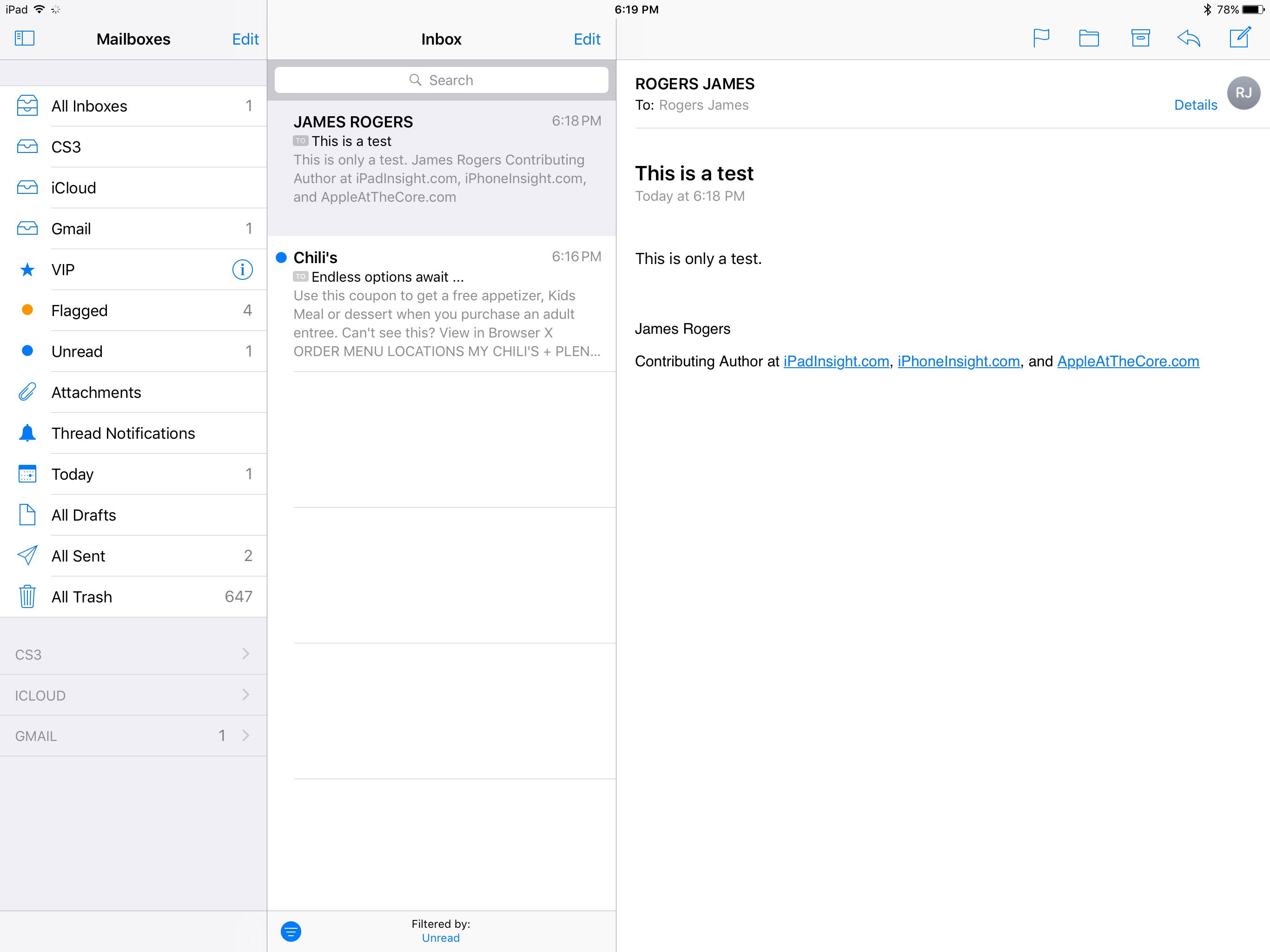 As a side note regarding the iOS Mail filters feature, there are also some quick links that make filtering using some of the more popular filters, fast and easy. There’s an edit button on the top-left of the screen. This is where the filtering quick links are located. While this is a convenient feature, not many people know they are there. They are super useful, but somewhat hidden, so Mail only gets partial points for these links.
